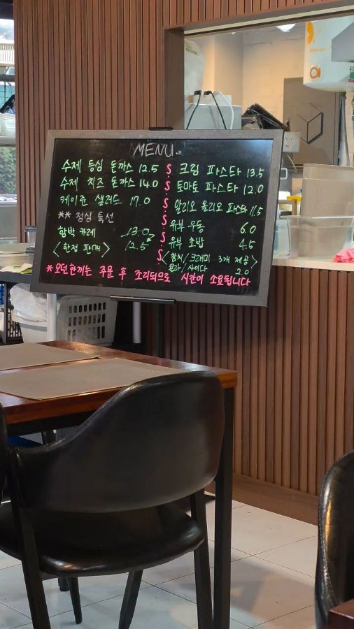 [모던한끼]의 메뉴는 돈까스, 파스타, 우동 등 다양한 선택지를 제공합니다. 특히, 이곳의 수제 돈까스는 빼놓을 수 없는 대표 메뉴입니다. 오늘은 등심 돈까스와 치즈 돈까스, 그리고 신선한 수제 샐러드를 주문해 보았습니다.