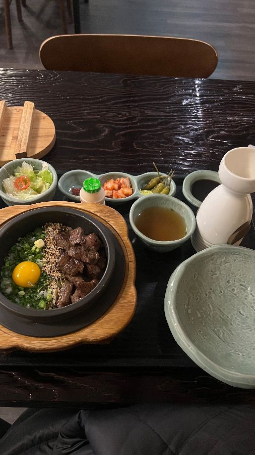 윤기가 흐르는 스테이크와 신선한 노른자가 조화로운 스테이크 솥밥 한 상차림입니다.