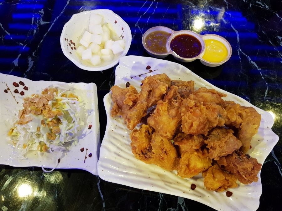 푸짐하게 담겨 나온 후라이드 치킨과 신선한 양배추 샐러드, 다채로운 소스들