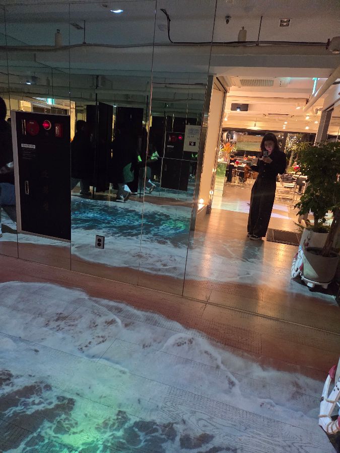 카페 바닥에 펼쳐진 파도치는 영상은 특별한 경험을 선사합니다.