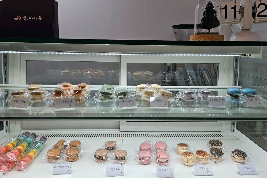 든든하게 배를 채우고 나니, 달콤한 디저트가 생각났다. 마침 ‘늘푸른목장’ 바로 옆에 ‘늘, 마카롱’이라는 아기자기한 카페가 있다는 것을 알게 되었다. 알고 보니 두 곳 모두 사장님이 같다고 했다. 왠지 모르게 더욱 기대감이 부풀어 올랐다. 카페 문을 열고 들어서자, 알록달록한 마카롱들이 진열된 쇼케이스가 눈에 들어왔다. (Image 6)