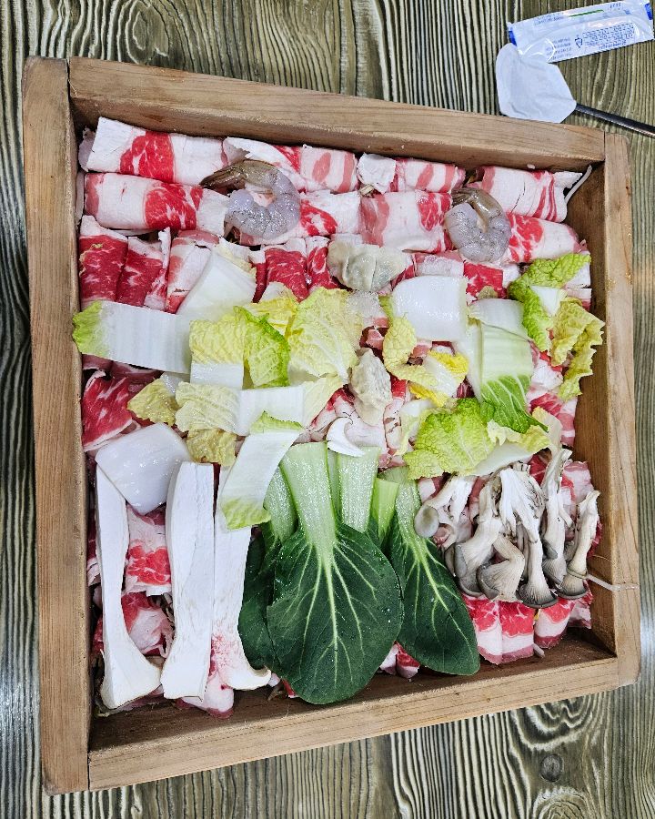 뚜껑을 여는 순간, 향긋한 편백나무 향이 코끝을 간지럽혔다. 찜기 안에는 차돌박이와 우삼겹, 새우, 만두, 그리고 싱싱한 채소들이 가지런히 놓여 있었다. 특히 배추, 청경채 등 채소의 푸릇푸릇한 색감이 눈을 사로잡았다. 시각적 분석 데이터에서 보았던 싱싱함이 그대로 느껴졌다. 마치 자연을 그대로 옮겨 놓은 듯한 비주얼이었다.