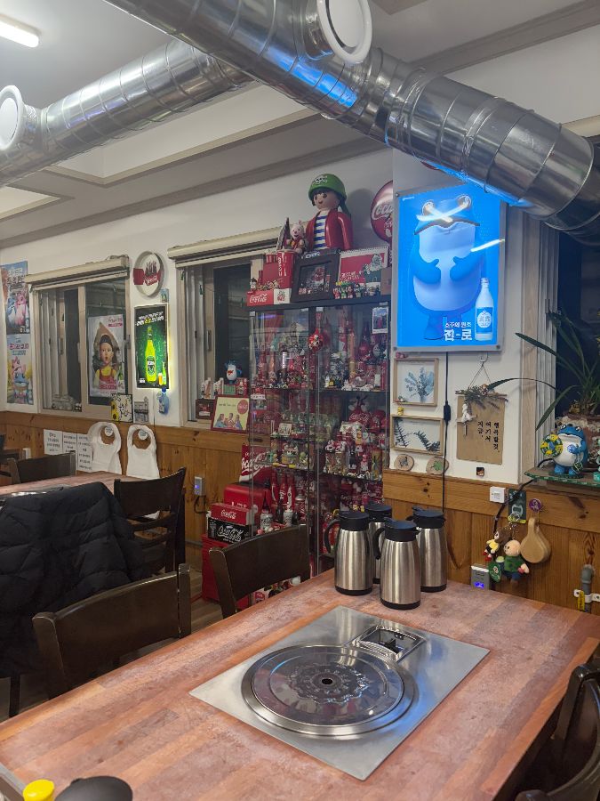 저녁 시간, 갈매기횟집 앞에 도착했을 때, 가장 먼저 눈에 들어온 건 가게 앞에 떡하니 자리 잡은 거대한 장어 조형물이었다. 밤이라 조명을 받아 번쩍거리는 모습이 꽤나 인상적이었다. (Image 2) 가게 안으로 들어서니, 밖에서 예상했던 것보다 훨씬 넓고 쾌적한 공간이 펼쳐졌다. 테이블 간 간격도 넉넉해서 편안하게 식사를 즐길 수 있을 것 같았다. 천장에는 큼지막한 스테인리스 배관이 지나가고, 한쪽 벽면에는 아기자기한 장식품들이 가득 찬 장식장이 놓여 있었다. (Image 1) 묘하게 정감 가는 분위기였다.
