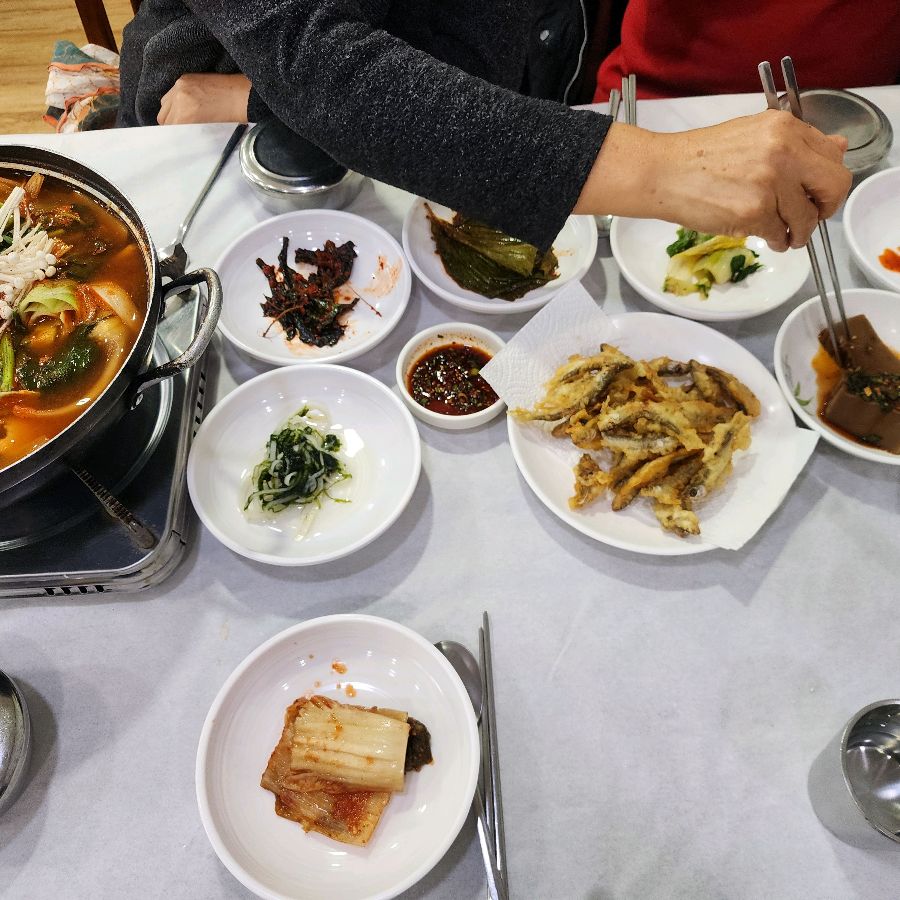 주문을 마치자, 정갈한 밑반찬들이 하나둘씩 테이블 위에 놓였다. 윤기가 흐르는 더덕구이, 바삭하게 구워진 해물 김치전, 신선한 나물, 짭짤한 장아찌 등 다채로운 구성에 감탄했다. 특히 따뜻하게 구워져 나온 김치전은 매콤하면서도 고소한 맛이 일품이었다. 밑반찬 하나하나에서 정성이 느껴졌다. 젓가락을 멈출 수 없을 정도로 맛있었다.