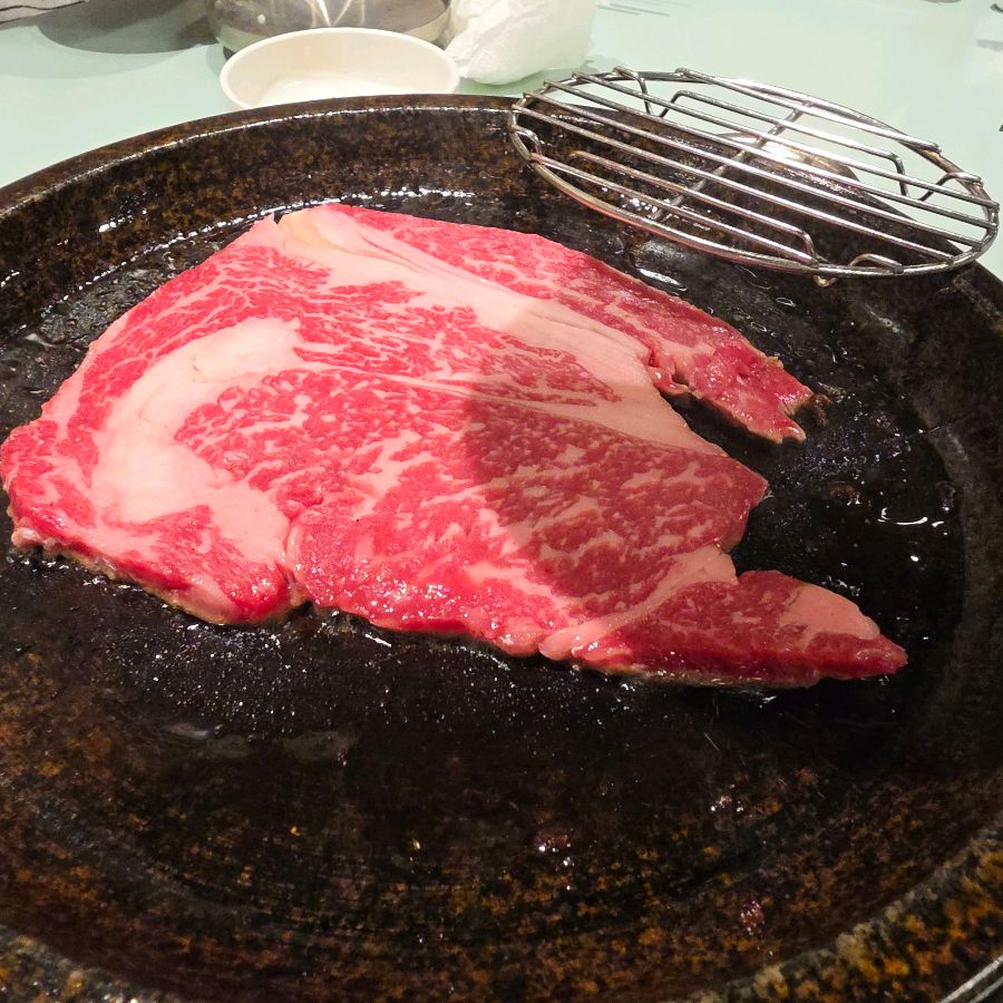 주문 후, 곧바로 밑반찬이 테이블 위에 차려졌다. 깔끔하게 담겨 나온 깍두기, 샐러드, 쌈 채소 등이 보기에도 좋았다. 특히 눈에 띄는 건 큼지막한 깍두기가 들어간 시원한 동치미! 살얼음이 동동 뜬 동치미 국물을 한 입 마시니, 입안이 개운해지는 느낌이었다. 곧이어 기다리고 기다리던 한우 등심이 등장했다. 붉은 빛깔의 신선한 고기, 섬세하게 박혀있는 마블링이 입맛을 다시게 했다. 뜨겁게 달궈진 돌판 위에 등심을 올리니, 치익- 하는 소리와 함께 고소한 냄새가 코를 자극했다.