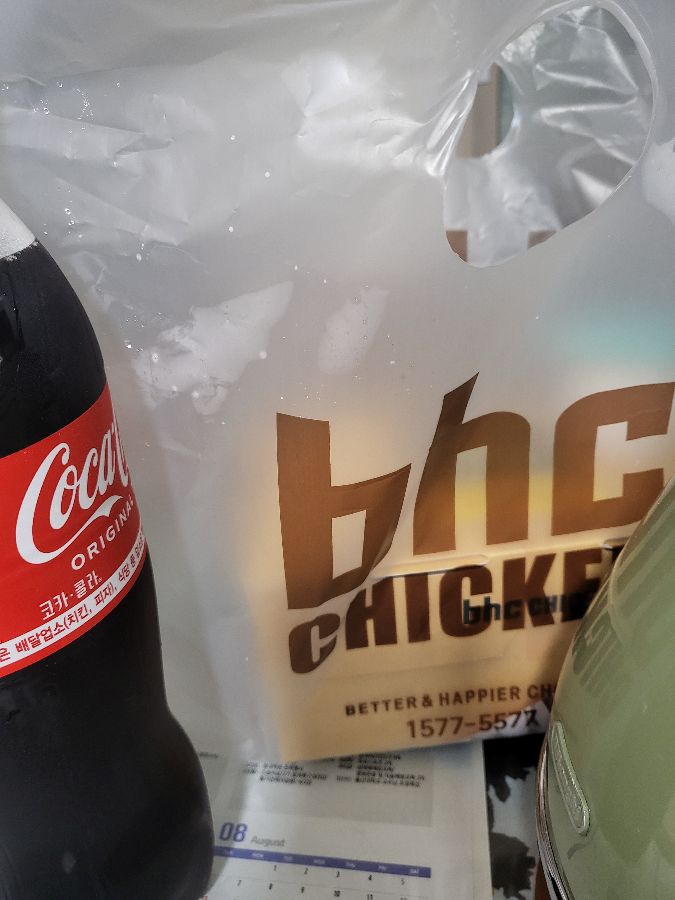 BHC치킨 동삼점 배달 봉투와 콜라