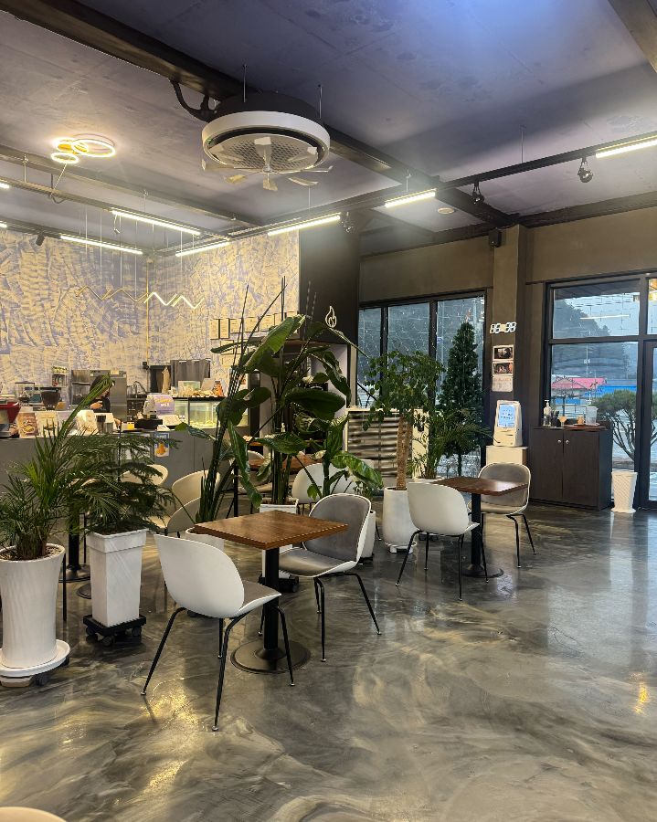 카페 문을 열고 들어서는 순간, 따스한 햇살과 함께 모던하면서도 편안한 분위기가 나를 감쌌다. 높은 천장과 넓은 창 덕분에 시원한 개방감이 느껴졌고, 곳곳에 놓인 초록 식물들이 싱그러움을 더했다. 마치 잘 꾸며진 식물원에 들어온 듯한 느낌이었다. 차분한 그레이 톤의 바닥과 우드톤 테이블, 그리고 감각적인 조명이 어우러져 세련된 분위기를 자아냈다. 인테리어가 멋져요라는 리뷰들이 괜한 말이 아니었음을 실감했다.