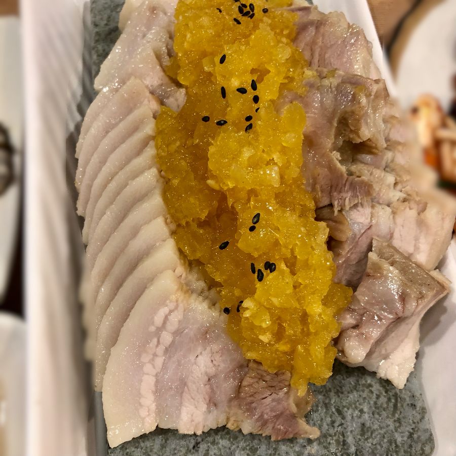 드디어 기다리고 기다리던 마늘보쌈이 나왔다. 윤기가 자르르 흐르는 보쌈 위에 황금빛 마늘 소스가 듬뿍 올려진 모습은 그야말로 환상적이었다 (Image 1). 얇게 슬라이스 된 보쌈은 먹기 좋은 크기로 가지런히 놓여 있었고, 그 위에는 검은깨가 솔솔 뿌려져 있어 시각적인 아름다움까지 더했다. 사진으로만 보던 비주얼을 실제로 마주하니, 저절로 침이 꼴깍 넘어갔다.