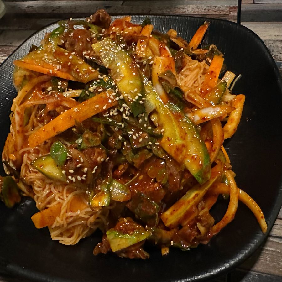 잠시 후, 드디어 기다리고 기다리던 골뱅이무침이 먼저 등장했다. 검은색 접시 위에 푸짐하게 담긴 골뱅이무침은 보기만 해도 침샘을 자극하는 강렬한 비주얼을 자랑했다. 윤기가 자르르 흐르는 큼지막한 골뱅이와 아삭아삭한 채소들이 매콤한 양념에 버무려져 있었고, 그 위에는 깨가 듬뿍 뿌려져 있었다. 사진으로 보이는 것처럼 오이, 당근 등 채소의 색감도 아주 신선했다. (Image 2 참고)