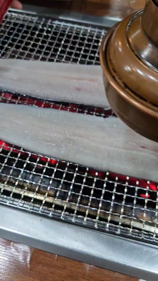 드디어 기다리고 기다리던 민물장어가 등장했다. 큼지막한 장어가 숯불 위에 올려지니, 순식간에 지글거리는 소리와 함께 고소한 냄새가 코를 자극했다. 직원분들이 직접 장어를 구워주는 시스템이라 더욱 편안하게 식사를 즐길 수 있었다. 능숙한 솜씨로 장어를 뒤집고 자르는 모습에서 전문가의 향기가 느껴졌다. 특히 외국인 직원분의 능숙한 솜씨가 인상적이었다.