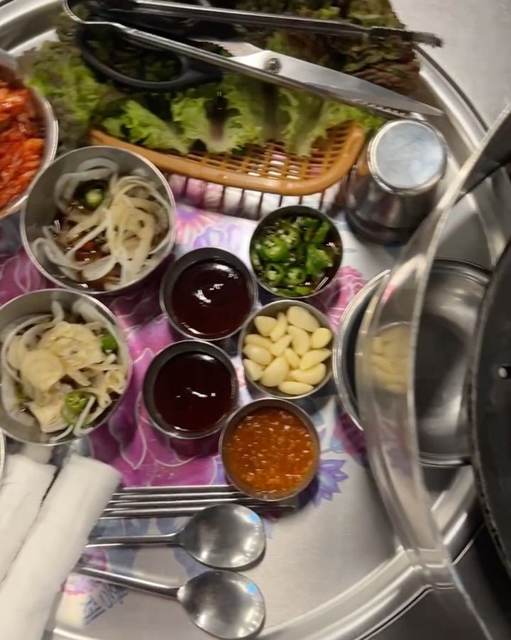 자리에 앉자마자 눈에 띈 것은 커다란 솥뚜껑이었다. 마치 어릴 적 할머니 댁에서 보던 솥뚜껑처럼 정겨운 느낌을 주었다. 곧이어 직원분이 능숙한 솜씨로 숯불을 피워주셨고, 솥뚜껑이 달궈지기 시작했다. 밑반찬이 하나 둘 차려지기 시작했는데, 쟁반 가득 담긴 모습이 마치 잘 차려진 한 상 같았다. 싱싱한 쌈 채소부터 시작해서, 쌈무, 갓김치, 콩나물 등 고기와 곁들여 먹기 좋은 반찬들이었다. 특히 눈길을 끈 것은 다양한 소스들이었다. 멜젓, 쌈장, 간장 소스 등 취향에 따라 고기를 즐길 수 있도록 세심하게 준비되어 있었다.