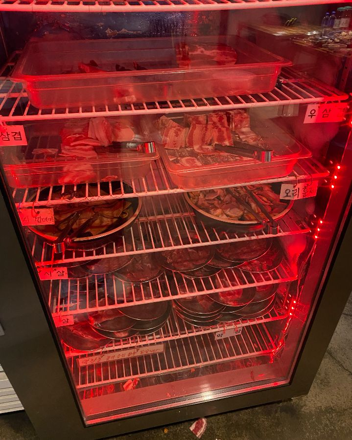 셀프바 옆에는 고기 냉장고가 자리 잡고 있었는데, 붉은 조명 아래 가지런히 놓인 고기들의 모습이 꽤나 먹음직스러워 보였다. Image 5에서 보이는 것처럼 냉장고 안에는 삼겹살, 목살, 오리고기 등 다양한 종류의 고기들이 층층이 쌓여 있었고, 원하는 부위를 마음껏 가져다 먹을 수 있도록 되어 있었다.