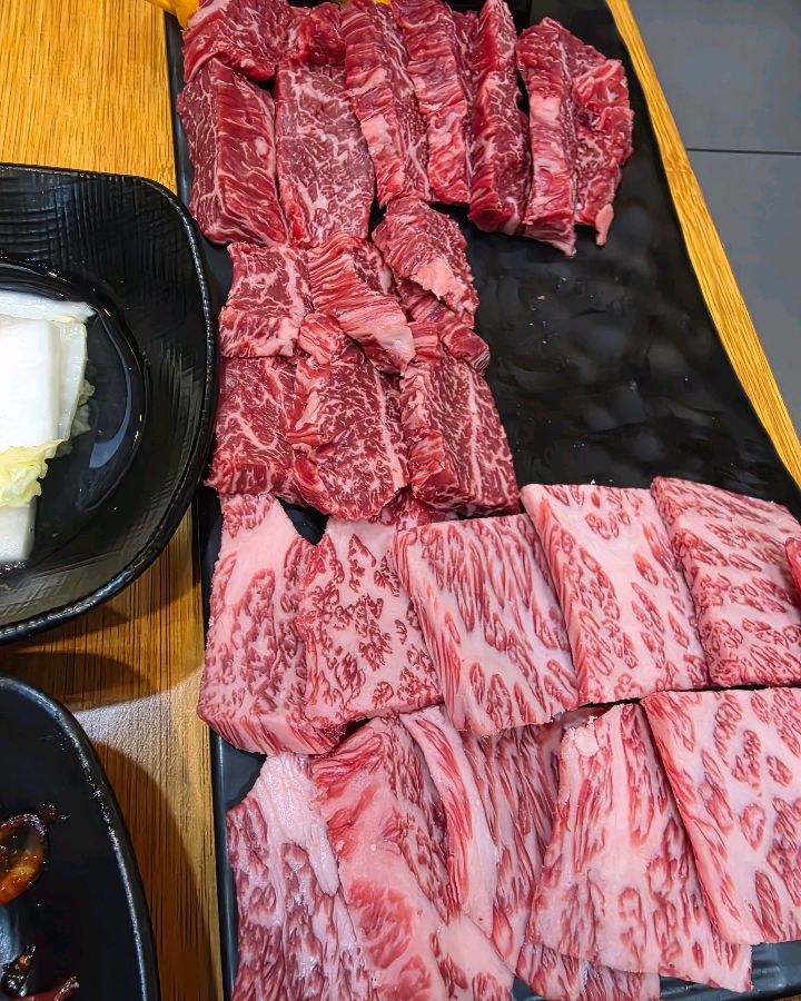 메뉴판을 펼치자 다채로운 한우 부위들이 유혹했다. 살치살, 채끝등심, 안심… 고민 끝에 우리는 ‘큰집세트’를 주문했다. 잠시 후, 테이블 위로 펼쳐진 광경은 탄성을 자아내게 했다. 붉은 빛깔의 한우는 섬세한 마블링을 자랑하며 신선함을 뽐냈다. 특히, 드라이에이징 숙성을 거친 한우는 겉은 살짝 말라있지만 속은 촉촉함을 유지하며 깊은 풍미를 예고했다. 사진에서처럼 다양한 부위가 정갈하게 담겨 나왔는데, 그 양도 둘이 먹기에 부족함이 없었다. 곁들여 나오는 반찬들도 하나하나 정성이 느껴졌다. 신선한 샐러드, 짭짤한 장조림, 시원한 묵사발 등 다채로운 맛은 입맛을 돋우기에 충분했다.