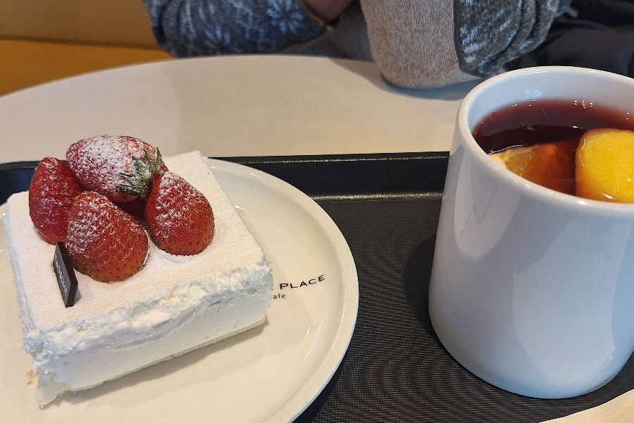 눈처럼 하얀 생크림 위에 붉은 딸기가 얹어진 케이크와 따뜻한 뱅쇼