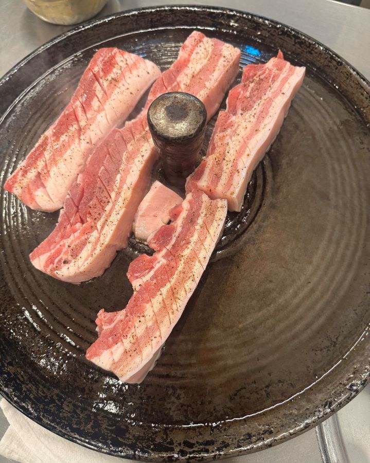 자리에 앉자마자 직원분께서 친절하게 메뉴를 안내해 주셨다. 메뉴는 심플하게 삼겹살과 목살, 그리고 갈비본살 세 가지였다. 우리는 아이와 함께 먹을 거라, 먼저 목살 2인분과 삼겹살 2인분을 주문했다. 잠시 후, 묵직한 솥뚜껑이 테이블 위에 올려지고, 곧이어 직원분이 직접 고기를 구워주시기 시작했다.
