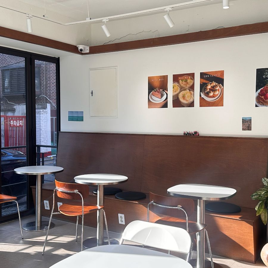 문을 열자 은은하게 퍼지는 커피 향과 달콤한 디저트 냄새가 코를 간지럽혔다. 마치 비밀스러운 아지트에 들어온 듯한 기분이었다. 화이트와 우드톤으로 꾸며진 내부는 깔끔하면서도 아늑했고, 곳곳에 놓인 작은 소품들이 공간에 생기를 불어넣고 있었다. 벽면에는 다양한 디저트 사진들이 걸려 있었는데, 하나같이 먹음직스러워 보여 군침이 절로 삼켜졌다.