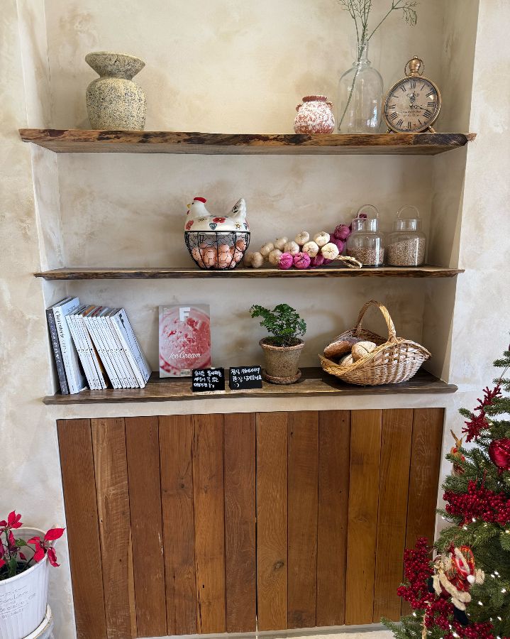 문을 열고 들어서자, 은은하게 퍼지는 커피 향과 따뜻한 분위기가 나를 맞이했다. 높은 천장과 넓은 창 덕분에 햇살이 가득 들어왔고, 아늑한 조명이 더해져 편안한 느낌을 주었다. 마치 프랑스 영화 속에 들어온 듯한 기분이었다. 벽 한쪽에는 나무 선반이 놓여 있었는데, 앤티크한 시계, 작은 화분, 그리고 빵이 담긴 바구니 등 아기자기한 소품들이 놓여 있어 구경하는 재미가 쏠쏠했다.