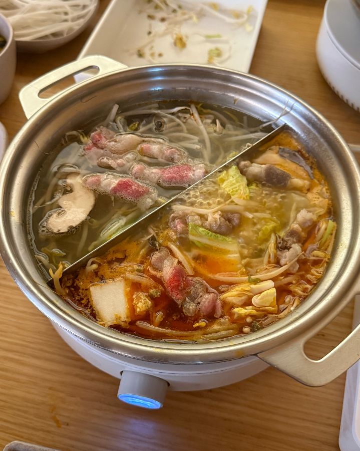 주문은 테이블에 비치된 태블릿으로 간편하게 할 수 있었다. 잠시 후, 정갈하게 차려진 한 상이 눈앞에 놓였다. 뽀얀 빛깔의 기본 육수와 붉은 빛깔의 얼큰 육수가 나란히 담긴 냄비, 신선한 야채와 얇게 썰린 우삼겹, 그리고 3가지 소스가 개인 트레이에 담겨 나왔다.