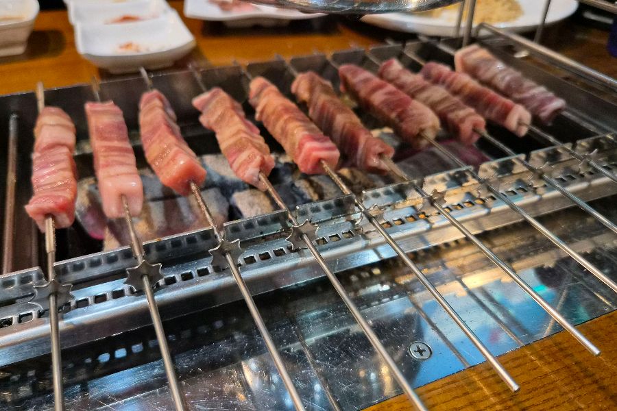 드디어 기다리고 기다리던 양꼬치가 등장했다. 붉은빛을 띠는 신선한 양고기가 꼬치에 가지런히 꽂혀 있는 모습은, 그 자체로도 훌륭한 비주얼이었다. 양꼬치를 숯불 위에 올리자, 치이익 소리와 함께 고소한 냄새가 코를 자극했다. 저절로 침이 꼴깍 넘어갔다.