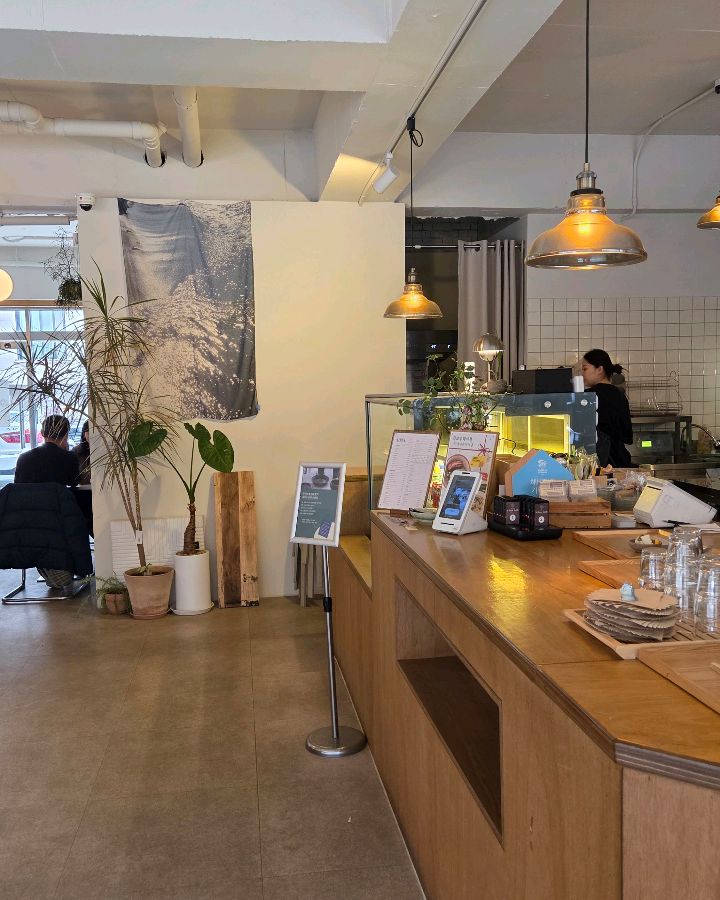 매장 안은 생각보다 넓었고, 테이블 간 간격도 넉넉해서 편안하게 식사를 즐길 수 있는 분위기였다. 화이트 톤 벽면에 우드 가구를 배치하여 코지하면서도 세련된 느낌을 준다. 곳곳에 놓인 아기자기한 소품들과 싱그러운 화분들이 공간에 생기를 불어넣고 있었다. 특히, 크리스마스 시즌을 맞아 놓인 커다란 트리 장식이 눈에 띄었다. 알록달록한 오너먼트와 반짝이는 조명이 더해져 연말 분위기를 물씬 풍겼다.
