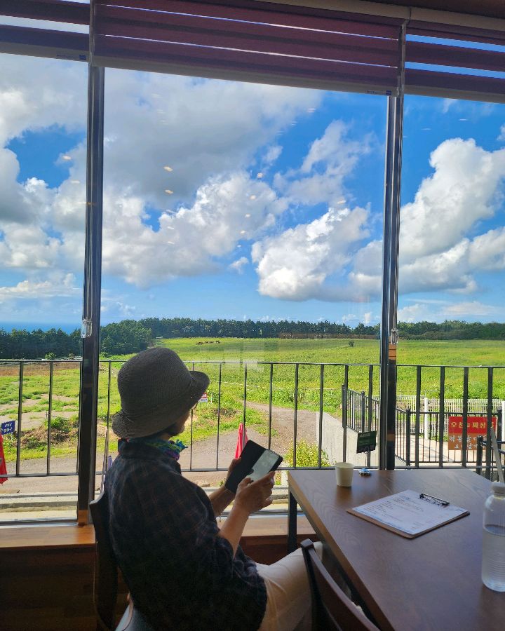통창으로 보이는 제주의 푸른 하늘과 초록 들판