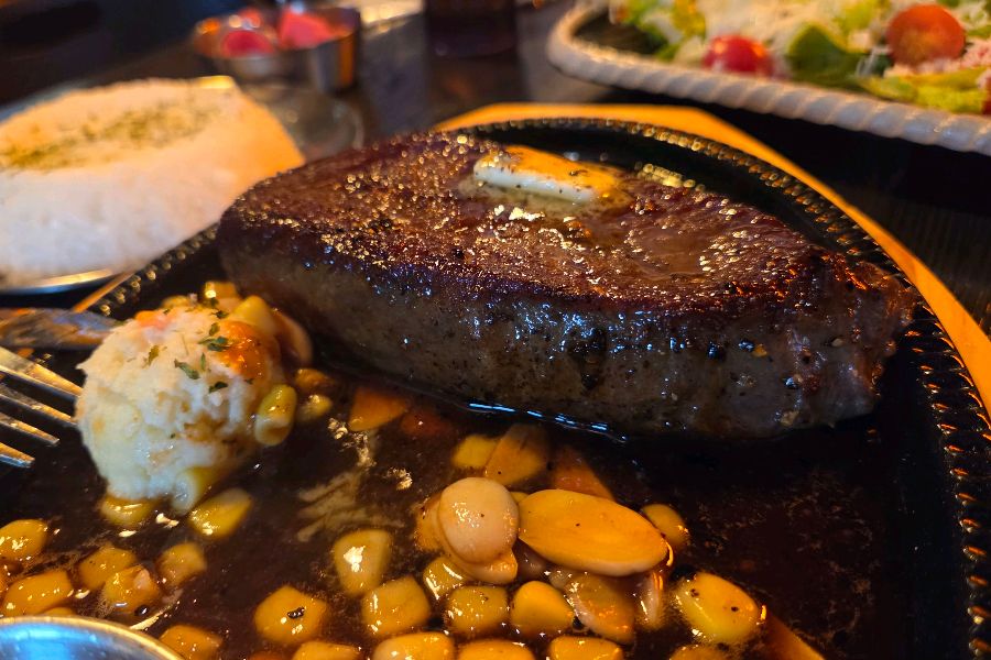 기다리고 기다리던 메인 메뉴, 도쿄st 버터스테이크가 드디어 테이블에 놓였다. 뜨겁게 달궈진 철판 위에 올려진 스테이크는 윤기가 자르르 흘렀고, 버터의 고소한 향이 식욕을 자극했다. 겉은 바삭하고 속은 촉촉하게 구워진 스테이크를 한 입 크기로 썰어 입에 넣으니, 부드러운 육질과 풍부한 육즙이 입안 가득 퍼져 나갔다. 스테이크 위에 살짝 녹아내린 버터는 풍미를 더욱 깊게 해주었고, 함께 제공된 와사비를 살짝 올려 먹으니 느끼함 없이 깔끔하게 즐길 수 있었다. 곁들여 나온 옥수수와 마늘, 소스 또한 스테이크와 완벽한 조화를 이루었다. 특히 스테이크 소스는 밥을 비벼 먹고 싶을 정도로 맛있었다.