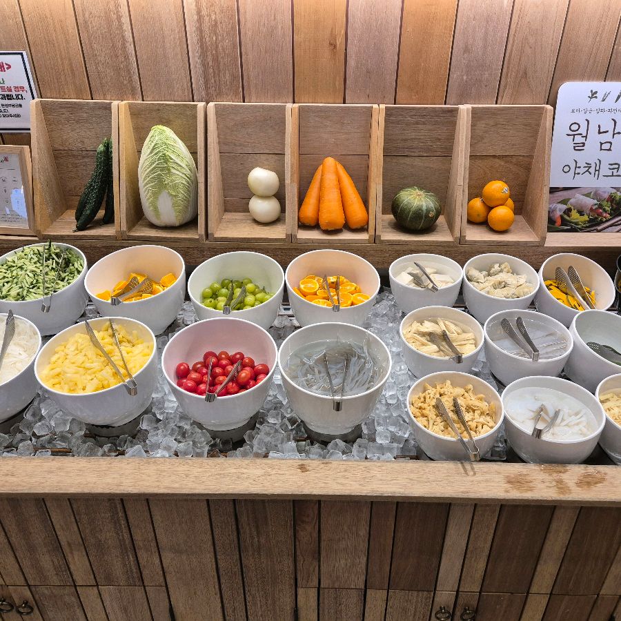 자리를 잡고 샐러드바로 향했다. 가장 먼저 눈에 띈 것은 신선한 채소 코너였다. 마치 정원을 옮겨 놓은 듯 싱싱한 야채들이 종류별로 보기 좋게 진열되어 있었다. 샐러드 채소뿐만 아니라 샤브샤브에 넣어 먹을 수 있는 다양한 버섯과 푸주, 건두부, 중국 당면까지 준비되어 있는 점이 마음에 쏙 들었다. 재료 하나하나의 신선도가 눈으로도 느껴질 정도였다. 샐러드바 한켠에는 월남쌈 코너도 마련되어 있었는데, 이곳 역시 신선한 채소와 과일이 가득 채워져 있었다.