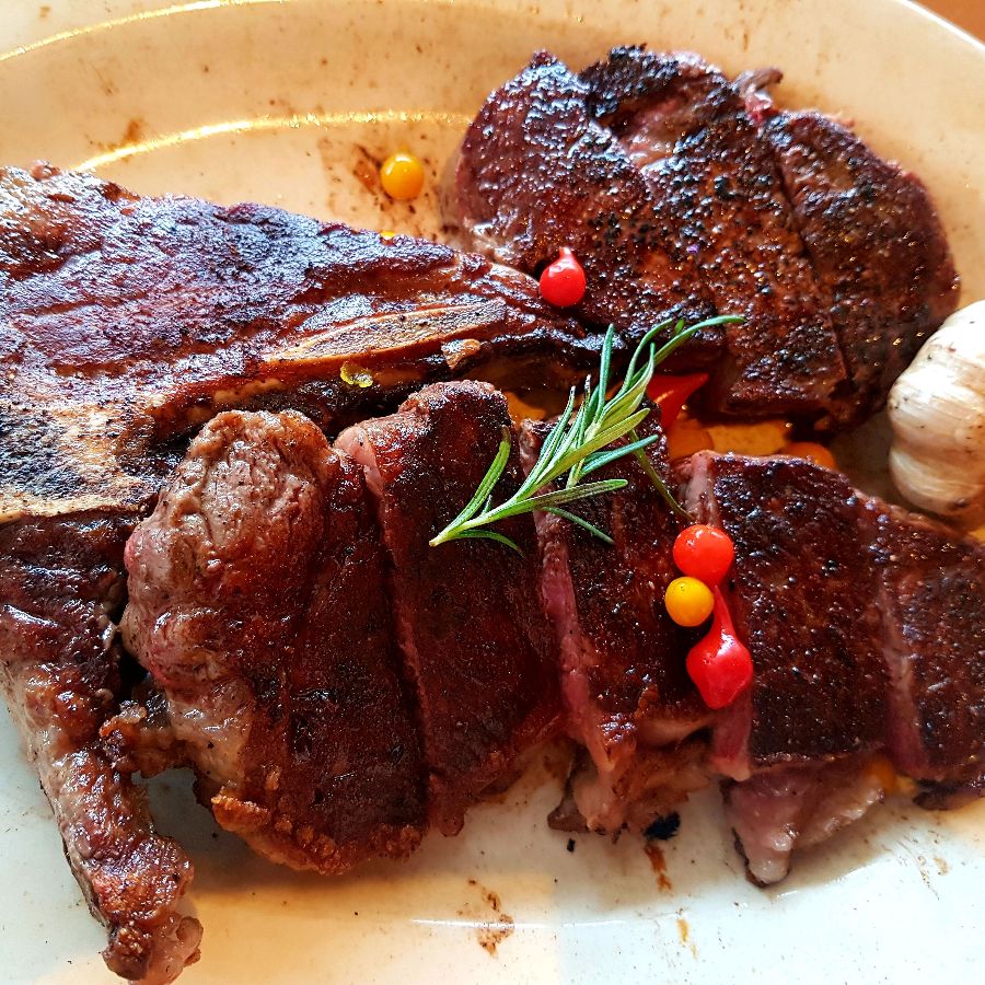 드디어 메인 메뉴인 스테이크가 등장했다. 뜨거운 철판 위에서 지글거리는 소리와 함께, 육즙 가득한 스테이크의 향이 코를 자극했다. 우리는 미디움 레어로 주문했는데, 굽기 정도도 딱 알맞았다. 나이프로 스테이크를 조심스럽게 썰어 한 입 맛보니, 입안에서 살살 녹는 듯한 부드러운 식감과 풍부한 육즙이 환상적인 조화를 이루었다. 겉은 바삭하고 속은 촉촉한, 겉바속촉의 정석이었다. 곁들여 나온 구운 채소와 소스 또한 스테이크의 풍미를 더욱 깊게 만들어주었다.