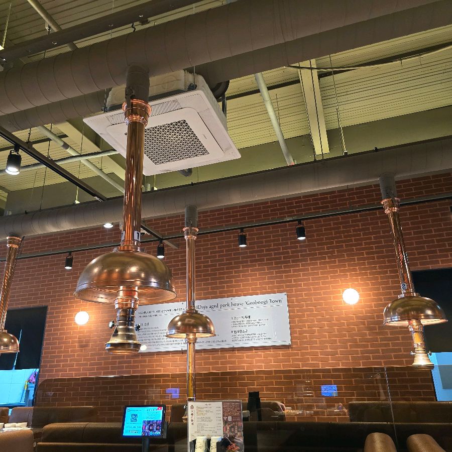 문을 열고 들어서자, 넓고 쾌적한 공간이 펼쳐졌다. 테이블 간 간격도 넉넉해서 편안하게 식사를 즐길 수 있을 것 같았다. 은은한 조명 아래, 테이블마다 놓인 화로에는 숯불이 은은하게 타오르고 있었다. 후드 덕트와 조명이 함께 연결된 독특한 형태의 구조물이 천장에 매달려 있었는데, 마치 거북이 등껍질을 연상시키는 듯했다.