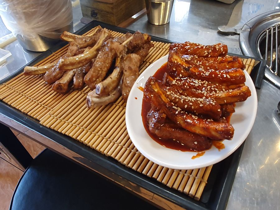 드디어 기다리고 기다리던 쪽갈비가 등장했다. 간장 쪽갈비는 윤기가 좔좔 흐르는 겉면에 깨가 듬뿍 뿌려져 있었고, 매운 쪽갈비는 보기만 해도 침샘을 자극하는 매콤한 양념이 발려 있었다. 사진으로 봤던 것보다 양이 꽤 많았다. 쪽갈비는 이미 초벌이 되어 나오기 때문에, 숯불에 살짝만 더 구워서 먹으면 된다고 했다.
