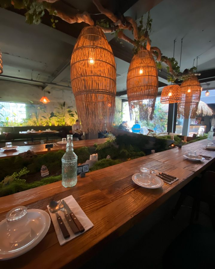 문을 열고 들어서는 순간, 탄성이 절로 나왔다. 밖에서 상상했던 것 이상으로 이국적인 분위기가 펼쳐졌다. 어두운 조명 아래 라탄 소재의 조명갓이 은은하게 빛나고, 곳곳에 놓인 식물들이 정글에 온 듯한 느낌을 더했다. 사진으로만 보던 풍경이 눈앞에 펼쳐지니, 정말 다른 세계에 온 것 같았다.