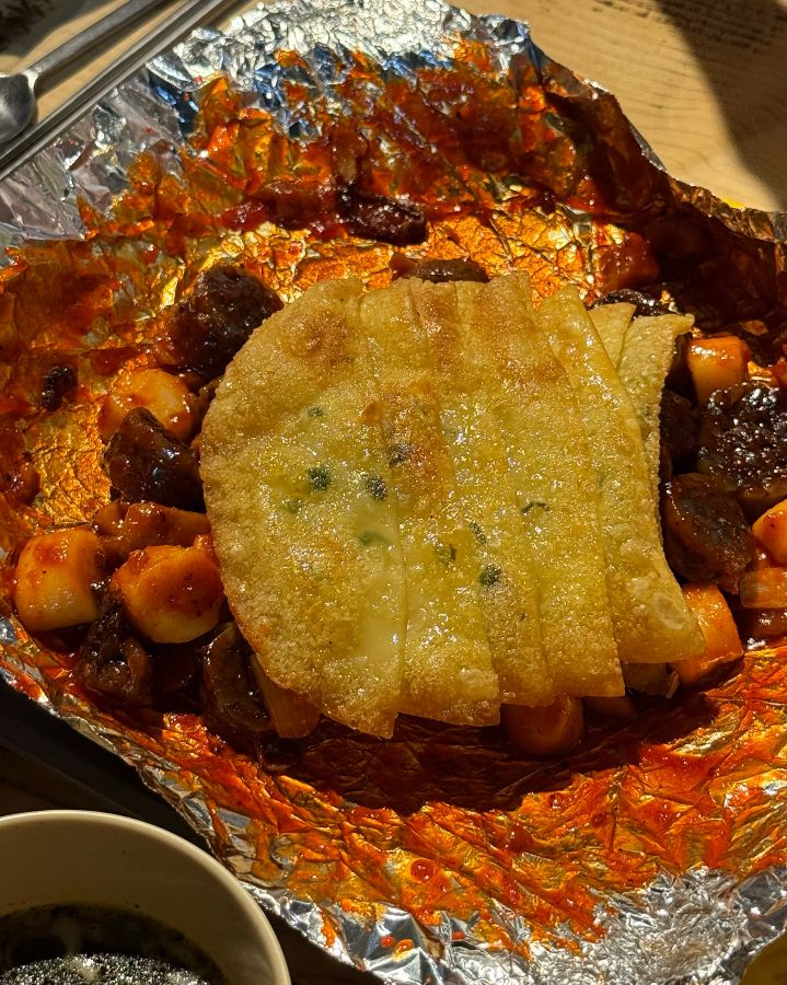 고민 끝에 꼬지순대떡볶이와 납작만두를 주문했습니다. 잠시 후, 은박지에 담겨 나온 떡볶이는 보기만 해도 군침이 돌았습니다. 떡, 순대, 꼬지, 양배추 등이 푸짐하게 들어있었고, 맵싹한 양념 냄새가 코를 자극했죠. 특히 떡은 한 입 크기로 잘려 있어 먹기에 편했습니다.