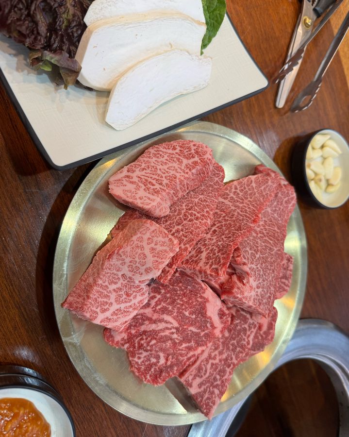 이곳은 독특하게도 정육식당 시스템으로 운영되고 있었다. 마치 정육점에 온 듯, 쇼케이스 안에는 다양한 부위의 한우들이 가지런히 놓여 있었다. 빛깔 좋은 살치살, 촉촉한 안심, 그리고 화려한 마블링을 자랑하는 꽃등심까지… 보기만 해도 군침이 절로 돌았다. 꼼꼼하게 고기의 상태를 확인하고, 안심과 갈비살을 적당량 주문했다. 마치 숙련된 장인이 섬세하게 조각해 놓은 듯한 마블링은, 그 자체로도 예술 작품처럼 느껴졌다.