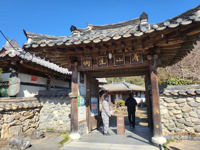 넓찍한 공터 주차장에 차를 대고, 돌담길을 따라 걸어 들어가니 웅장한 대문이 나타났다. 마치 시간 여행을 떠나는 듯한 기분이었다. 대문 위에 걸린 ‘수련산방’이라는 나무 간판은 세월의 흔적을 고스란히 담고 있었다. 대문을 들어서자, 아담하고 예쁜 정원이 눈에 들어왔다. 잘 가꿔진 나무들과 형형색색의 꽃들이 고택의 고즈넉한 분위기와 어우러져 그림 같은 풍경을 자아냈다.