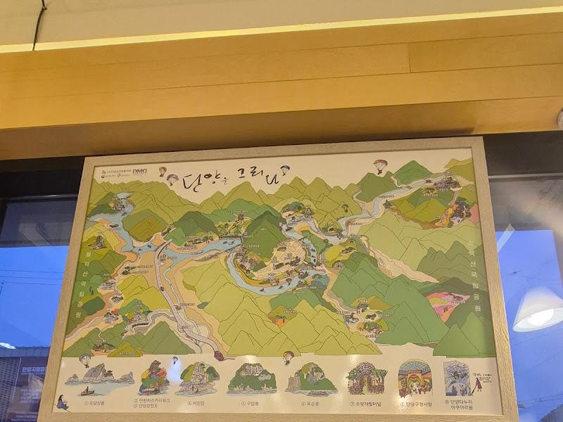매장 안으로 들어서자, 가장 먼저 눈에 띈 것은 벽면에 걸린 단양의 아름다운 풍경을 담은 그림이었다. 굽이굽이 흐르는 강물과 푸르른 산세가 한눈에 들어오는 그림을 보니, 단양에 왔다는 사실이 더욱 실감 났다. 그림 옆으로는 ‘예쁘면 단양’이라는 문구와 함께 단양의 명소를 소개하는 지도가 붙어 있었다. 식사를 기다리는 동안 지도를 살펴보며, 앞으로 방문할 곳들을 미리 찜해두는 재미도 쏠쏠했다. 깔끔한 인테리어 덕분에 다른 식당보다 훨씬 안심하고 식사할 수 있을 것 같다는 생각이 들었다. 천장에는 긴 선형 조명이 줄지어 늘어서 있어 밝고 모던한 느낌을 더했다.