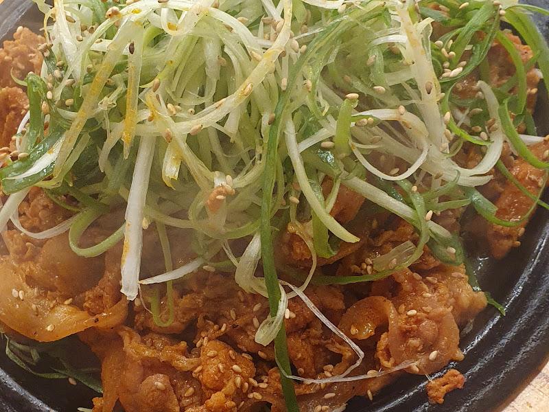 잠시 후, 기다리고 기다리던 고추장숯불구이가 등장했다. 뜨겁게 달궈진 철판 위에 얇게 썰린 돼지고기가 붉은 양념을 입고, 그 위에는 채 썬 대파가 듬뿍 올려져 있었다 . 매콤한 향과 함께 숯불 향이 은은하게 퍼져 나갔다. 시각적으로도, 후각적으로도 완벽한 조화였다.