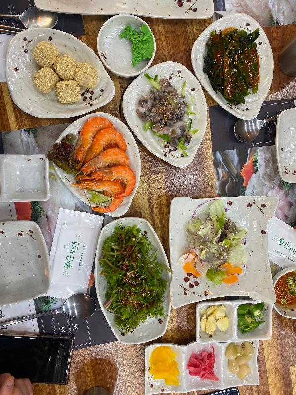메뉴판을 펼쳐 보니 다양한 해산물 요리들이 눈에 띄었다. 회, 매운탕, 칼국수 등등… 고민 끝에, 오늘의 주인공인 해물 물회와 칼국수를 주문했다. 특히 물회는 2인 이상 주문이 가능하다는 점을 참고해야 한다. 주문을 마치자, 곧바로 밑반찬들이 테이블 위를 가득 채웠다. 샐러드, 튀김, 해초 등등… 하나하나 정갈하게 담겨 나온 모습이 보기 좋았다. 특히 갓 튀겨져 나온 새우튀김은 바삭하고 고소해서, 메인 요리가 나오기 전 입맛을 돋우기에 충분했다. 곁들여 나온 콘치즈는 달콤하면서도 부드러운 맛이 일품이었다.