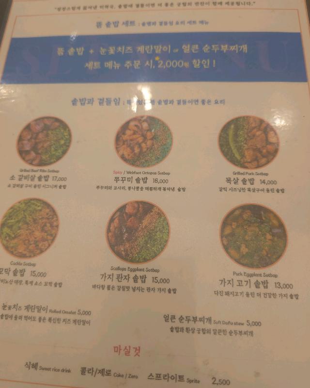 자리에 앉아 메뉴판을 펼쳐보니 다양한 솥밥 메뉴들이 나를 유혹했다. 쭈꾸미 솥밥의 매콤함, 목살 솥밥의 풍미, 소갈비 솥밥의 고급스러움… 고민 끝에 나의 선택은 매콤한 ‘매운 가지 솥밥’이었다. 퇴근 후 즐기는 든든한 한 끼, 이만한 메뉴가 없지! 특히 이벤트 중이라 9,000원이라는 착한 가격에 즐길 수 있다는 점도 마음에 쏙 들었다.