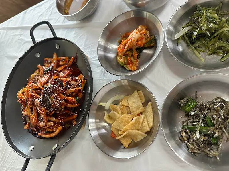 마침내 모습을 드러낸 오징어볶음은 사진으로 보던 것보다 훨씬 강렬한 비주얼을 자랑했다. 짙은 붉은색 양념이 윤기를 좔좔 흐르며, 테이블 위를 가득 채우는 매콤한 향이 코를 자극했다. 곁들여 나온 반찬들은 소박하지만 정갈했다. 김치, 콩나물무침, 멸치볶음 등 집밥 느낌이 물씬 풍기는 반찬들이 스테인리스 그릇에 담겨 나왔다. 특히 콩나물국은 시원하고 깔끔한 맛으로 입안을 개운하게 해주었다.