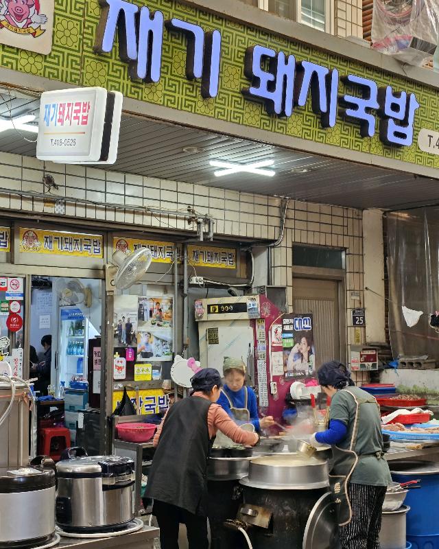 “재기돼지국밥” 간판을 찾는 건 어렵지 않았다. 파란색 글씨로 큼지막하게 쓰여진 간판은 한눈에 들어왔다. 가게 앞에는 커다란 솥에서 김이 모락모락 피어오르고 있었고, 분주하게 움직이는 이모님들의 모습에서 맛집의 포스가 느껴졌다.