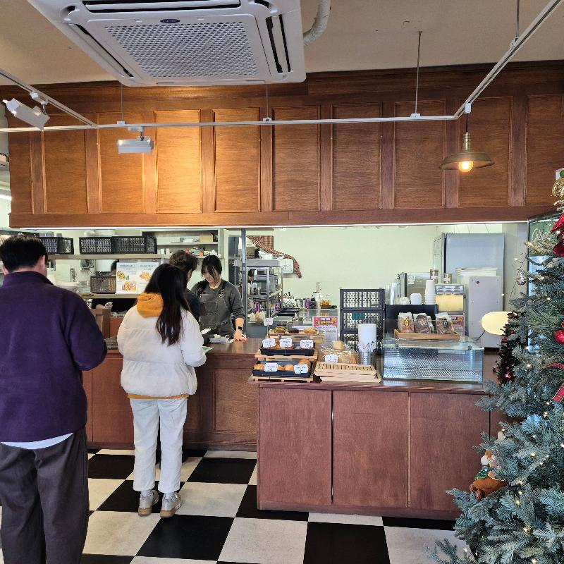 짙은 나무색으로 마감된 카운터와 흑백의 체크무늬 바닥 타일, 붉은색 가죽 의자가 놓인 테이블은 레트로하면서도 세련된 느낌을 자아냈다. 한쪽 벽면에는 빵과 샐러드 사진이 걸려 있었고, 크리스마스 시즌을 맞아 놓인 커다란 트리 장식이 따뜻함을 더했다. 마치 컬러테라피를 받는 듯 기분까지 좋아지는 공간이었다.