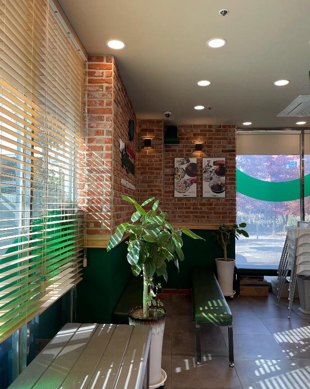 매장 입구에 들어서자 넓고 깔끔한 공간이 눈에 들어왔다. 테이블 간 간격도 넉넉해서 편안하게 식사를 즐길 수 있는 분위기였다. 마침 창가 자리가 비어 있어 자리를 잡았다. 햇살이 은은하게 들어오는 창가 자리는 언제나 옳다. 브라운 톤의 나무 테이블과 초록색 포인트 벽면이 어우러져 편안하고 자연스러운 느낌을 준다. 벽돌로 쌓아 올린 벽면에는 은은한 조명이 설치되어 있어 따뜻한 분위기를 더했다.