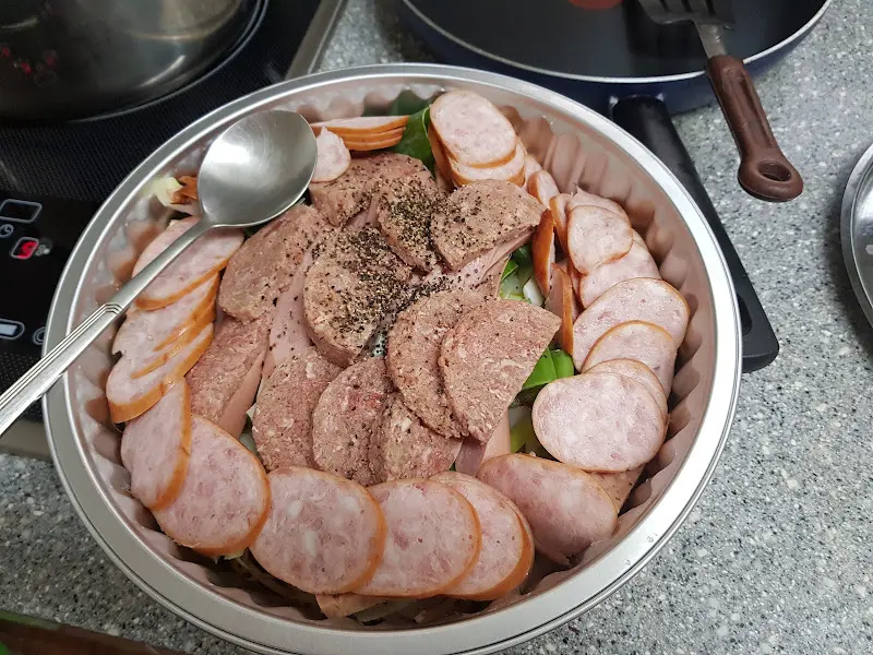 주문 후 얼마 지나지 않아, 테이블 위에는 부대찌개가 담긴 큼지막한 냄비가 놓였다. 뚜껑을 열자, 뽀얀 김이 솟아오르며 시각적인 향연이 펼쳐졌다. 햄, 소시지, 떡, 야채 등 다양한 재료들이 푸짐하게 담겨 있었고, 특히 수북하게 쌓인 콩나물과 김치가 인상적이었다. 을 보면 알 수 있듯이, 햄과 소시지의 양도 상당했지만, 콩나물과 김치의 존재감은 그 이상이었다. 일반적으로 부대찌개라고 하면 햄과 소시지의 기름진 맛을 떠올리기 쉽지만, 이곳의 부대찌개는 콩나물과 김치가 중심을 잡아주어 개운하고 시원한 맛을 낼 것 같았다.