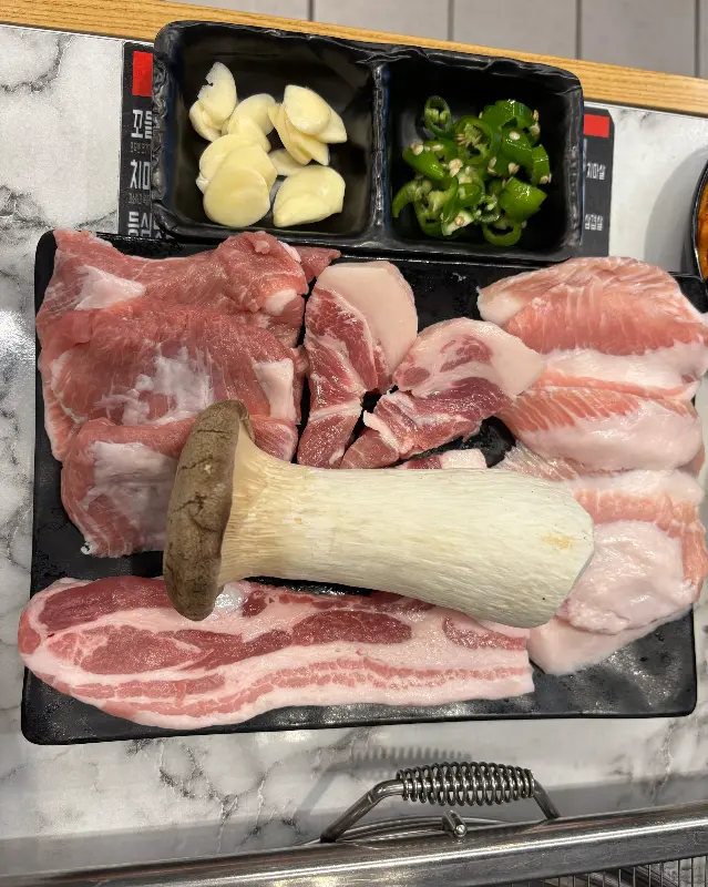 드디어 기다리고 기다리던 생고기 모듬이 등장했다. 선홍빛을 띠는 신선한 고기의 자태에 감탄이 절로 나왔다. 등심덧살, 꼬들목살, 치마살 등 다양한 부위가 먹음직스럽게 담겨 있었다. 큼지막한 새송이버섯 하나가 통째로 놓인 점도 인상적이었다.
