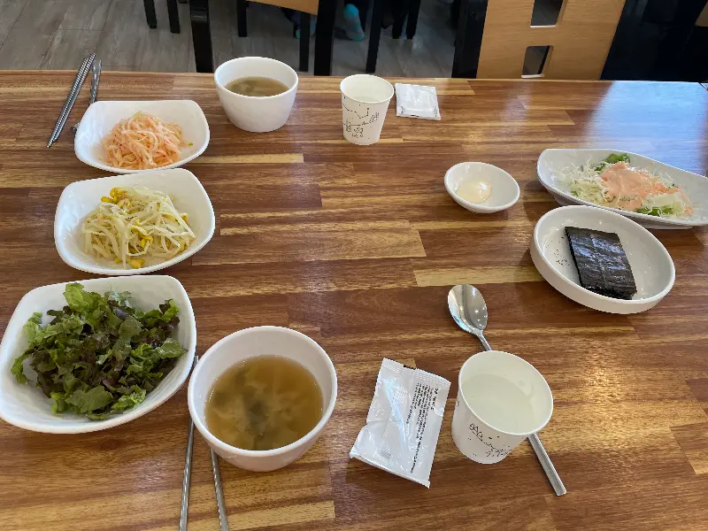 주문을 마치자, 직원분께서 기본 반찬을 가져다주셨다. 콩나물, 무생채, 샐러드, 김 등 쭈꾸미와 함께 비벼 먹으면 좋을 반찬들이었다. 특히 마음에 들었던 점은 반찬을 셀프로 리필할 수 있다는 점이었다. 샐러드와 마요네즈를 좋아하는 나는 몇 번이고 리필해서 먹을 생각에 벌써부터 신이 났다.
