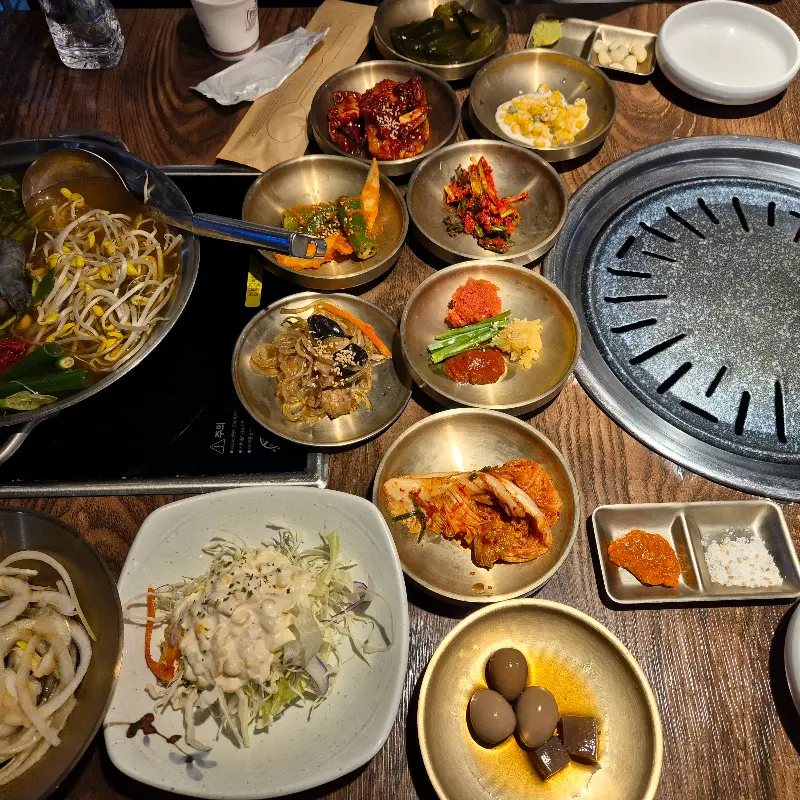 자리에 앉자마자 메뉴판을 펼쳐 들었다. 돼지갈비, 삼겹살, 목살, 소갈비살 등 다양한 메뉴가 있었지만, 오늘 나의 목표는 오직 돼지갈비였다. 2인분을 주문하고, 설레는 마음으로 주변을 둘러봤다. 곧이어 테이블 위로 하나 둘씩 반찬이 차려지기 시작했는데, 그 가짓수가 정말 어마어마했다. 샐러드, 잡채, 김치, 쌈 채소는 기본이고, 양념게장, 해물전골까지 나오는 것을 보고 입이 떡 벌어졌다. 특히, 기본으로 제공되는 해물전골은 시원하고 칼칼한 국물이 정말 일품이었다.