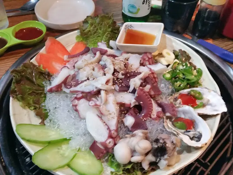 드디어 기다리고 기다리던 조개구이가 등장했다. 커다란 접시 가득 담긴 조개들의 자태에 입이 떡 벌어졌다. 싱싱한 가리비, 큼지막한 키조개, 쫄깃한 백합, 그리고 꼬들꼬들한 소라까지. 윤기가 좌르르 흐르는 조개들은 보기만 해도 신선함이 느껴졌다. 사진 속에서도 확인할 수 있듯이, 얼음 위에 올려진 멍게, 굴, 개불 등의 해산물 모듬은 그 신선함을 더욱 돋보이게 했다. 붉은 빛깔의 멍게와 투명한 굴의 조화는 보는 것만으로도 황홀경에 빠지게 했다.