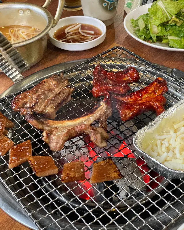 이미 초벌이 되어 나온 덕분에, 테이블 위 숯불에서 살짝만 더 익혀 먹으면 된다고 했다. 순한맛 쪽갈비는 윤기가 좌르르 흐르는 것이, 간장 양념의 은은한 단맛이 느껴지는 듯했다. 매운맛 쪽갈비는 보기만 해도 침샘을 자극하는 붉은 양념이 듬뿍 발려 있었다.