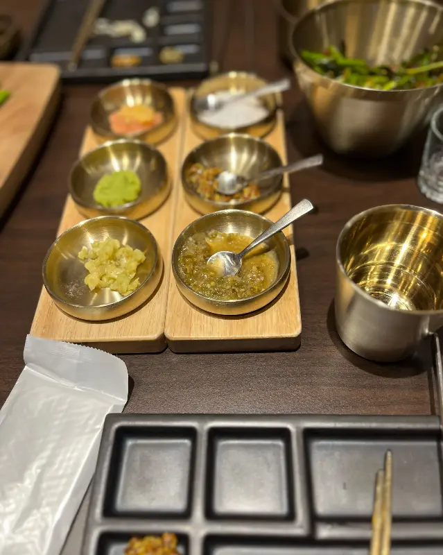 드디어 기다리고 기다리던 한우 모둠이 등장했다. 선명한 붉은 빛깔과 섬세한 마블링이 조화를 이룬 모습은, 마치 예술 작품을 감상하는 듯한 감탄을 자아냈다. 등심, 살치살, 갈비살 등 다채로운 부위들이 한 접시에 담겨 나왔는데, 그 신선함과 퀄리티가 한눈에 느껴졌다. 사진으로 담아내지 않을 수 없는 비주얼이었다.