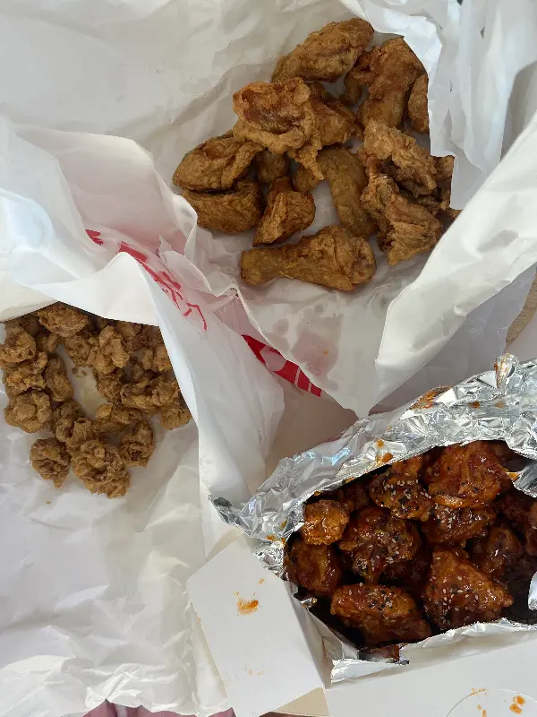 닭고기 자체도 신선했다. 퍽퍽한 가슴살만 있는 것이 아니라, 쫄깃한 닭다리 살도 적절히 섞여 있어서 좋았다. 닭 크기도 한 입에 먹기 좋은 크기로 잘 잘라져 있어서 먹기 편했다. 튀김옷도 두껍지 않고 바삭해서, 닭고기의 풍미를 제대로 느낄 수 있었다.
